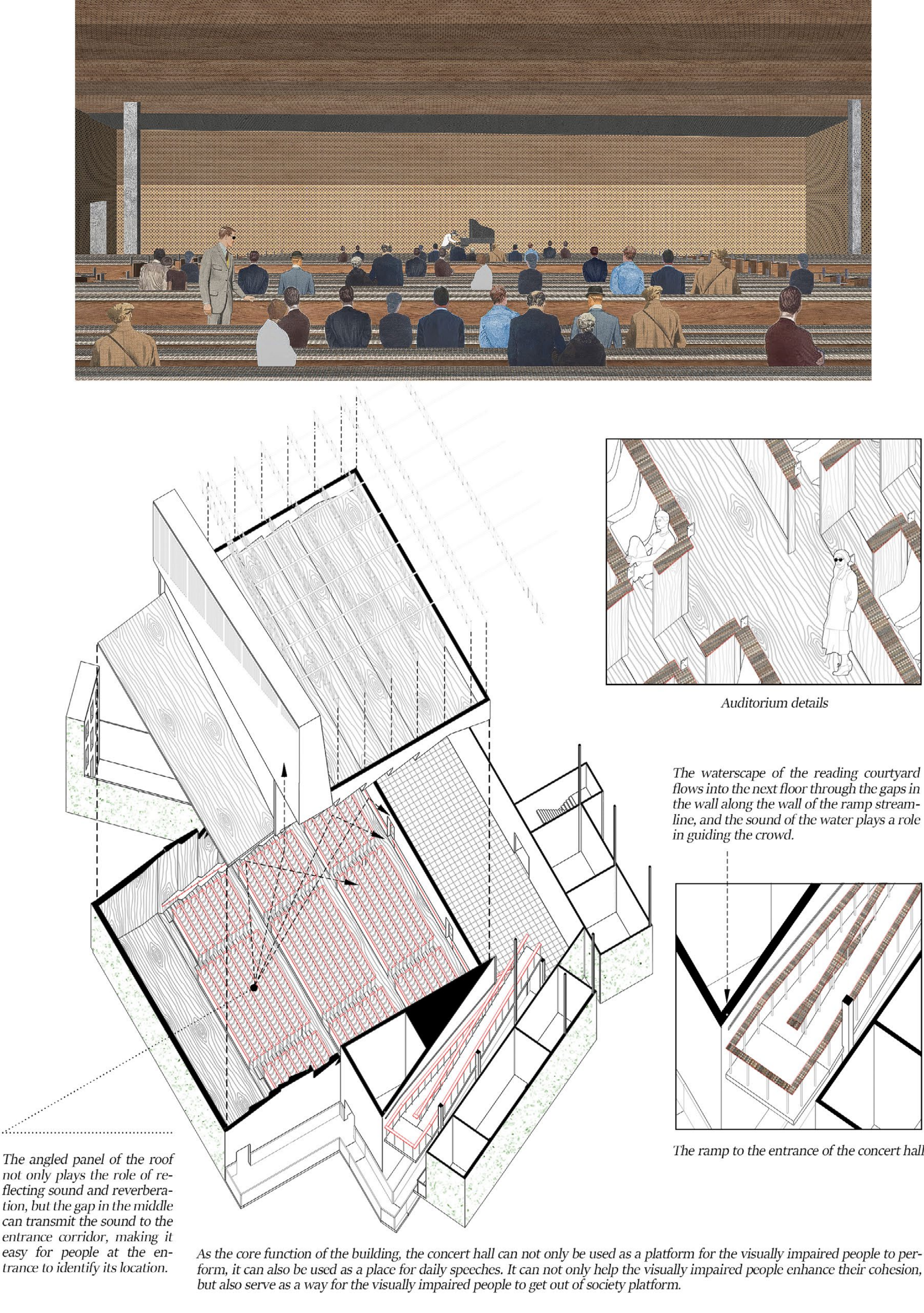 And this plan is to solve the higher-level needs (emotion, ability, value) of the vi-sually impaired. The plan puts the able-bodied and the visually impaired in onespace, and guides and perceives through multi-sensory stimulation besidesvision. The functional space that weakens the visual orientation serves as amedium for the able-bodied and the visually impaired to communicate andwork together, so that the society can have a deeper understanding of the visu-ally impaired and break the barrier between the two groups.